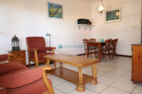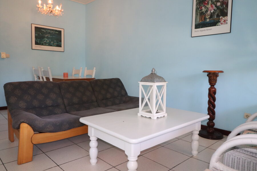 Woonkamer met zithoek , eettafel, tv en plafondventilator;